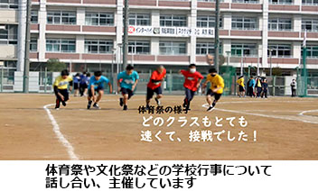 体育祭や文化祭など学校を動かしています。ボランティア活動を行い、堺高をアピールするのも大切な仕事です。選挙なしの役員もあります。