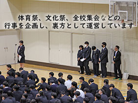 体育祭や文化祭などの学校行事を動かしたり支えたりしています。地域イベントやボランティア活動に参加して、堺高校をアピールするのも大切な仕事です。選挙なしの学年役員もあります。